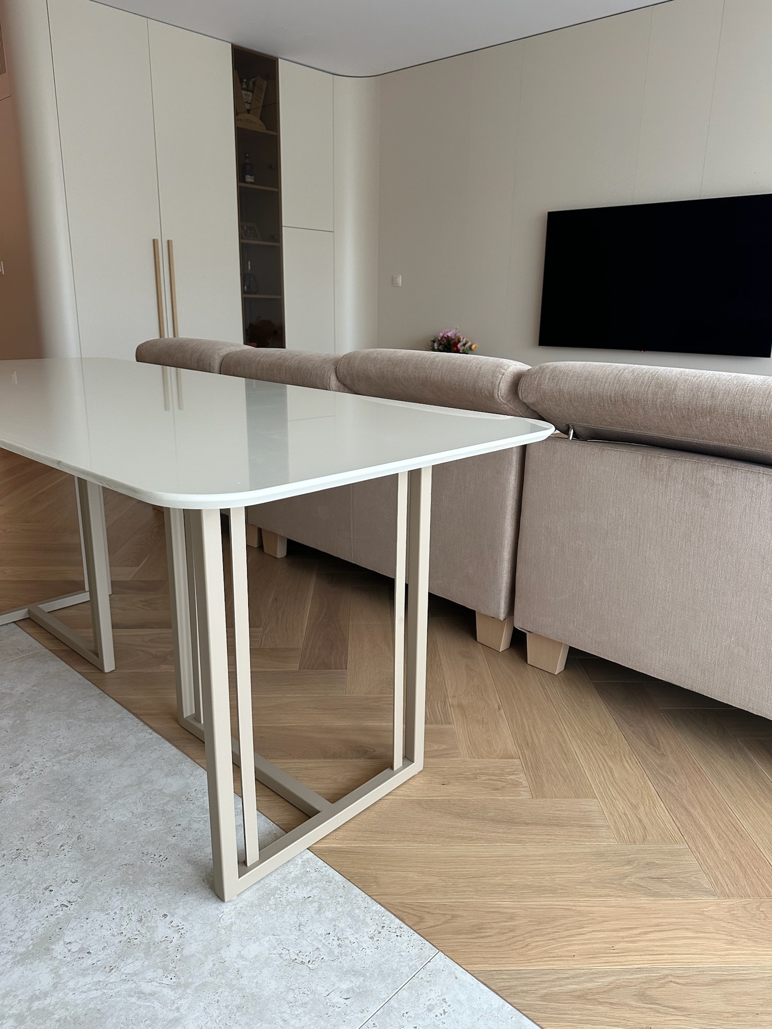 Naše podnože sú navrhnuté tak, aby sa dali prispôsobiť akémukoľvek materiálu stolovej dosky, vrátane skla, drevotriesky, MDF, kameňa, keramiky a masívu. Štandardne sú podnože pripravené na uchytenie dreva alebo drevotriesky. Pre sklenené dosky používame špeciálne nerezové konzolky. Pri kameňoch a keramike riešime uchytenie pomocou oporného rámu na mieru, ktorý obopína celý obvod dosky, aby sme zabezpečili pevné a stabilné uchytenie.