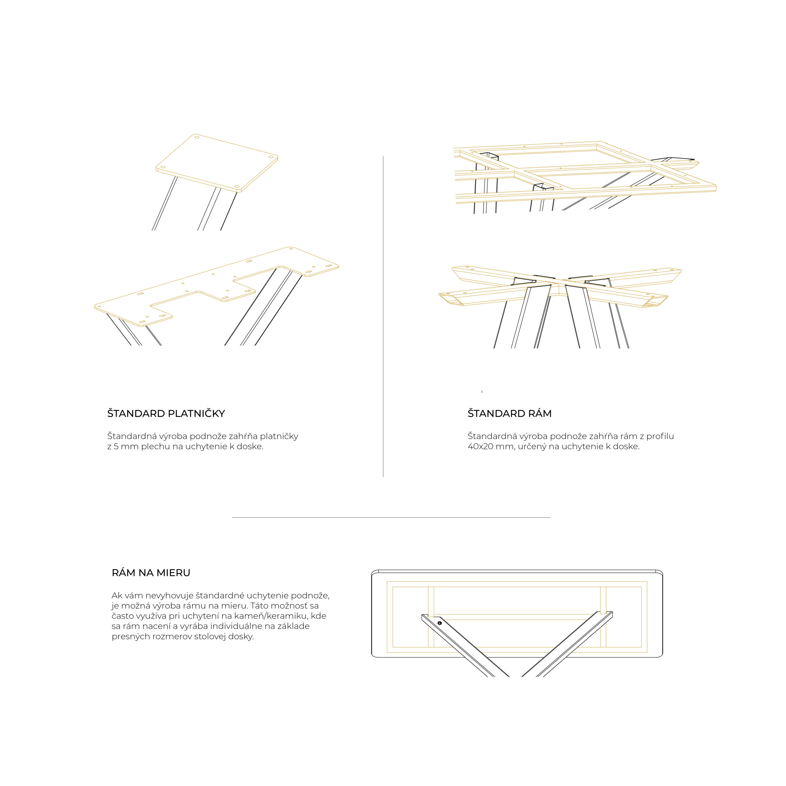Naše podnože sú navrhnuté tak, aby sa dali prispôsobiť akémukoľvek materiálu stolovej dosky, vrátane skla, drevotriesky, MDF, kameňa, keramiky a masívu. Štandardne sú podnože pripravené na uchytenie dreva alebo drevotriesky. Pre sklenené dosky používame špeciálne nerezové konzolky. Pri kameňoch a keramike riešime uchytenie pomocou oporného rámu na mieru, ktorý obopína celý obvod dosky, aby sme zabezpečili pevné a stabilné uchytenie.