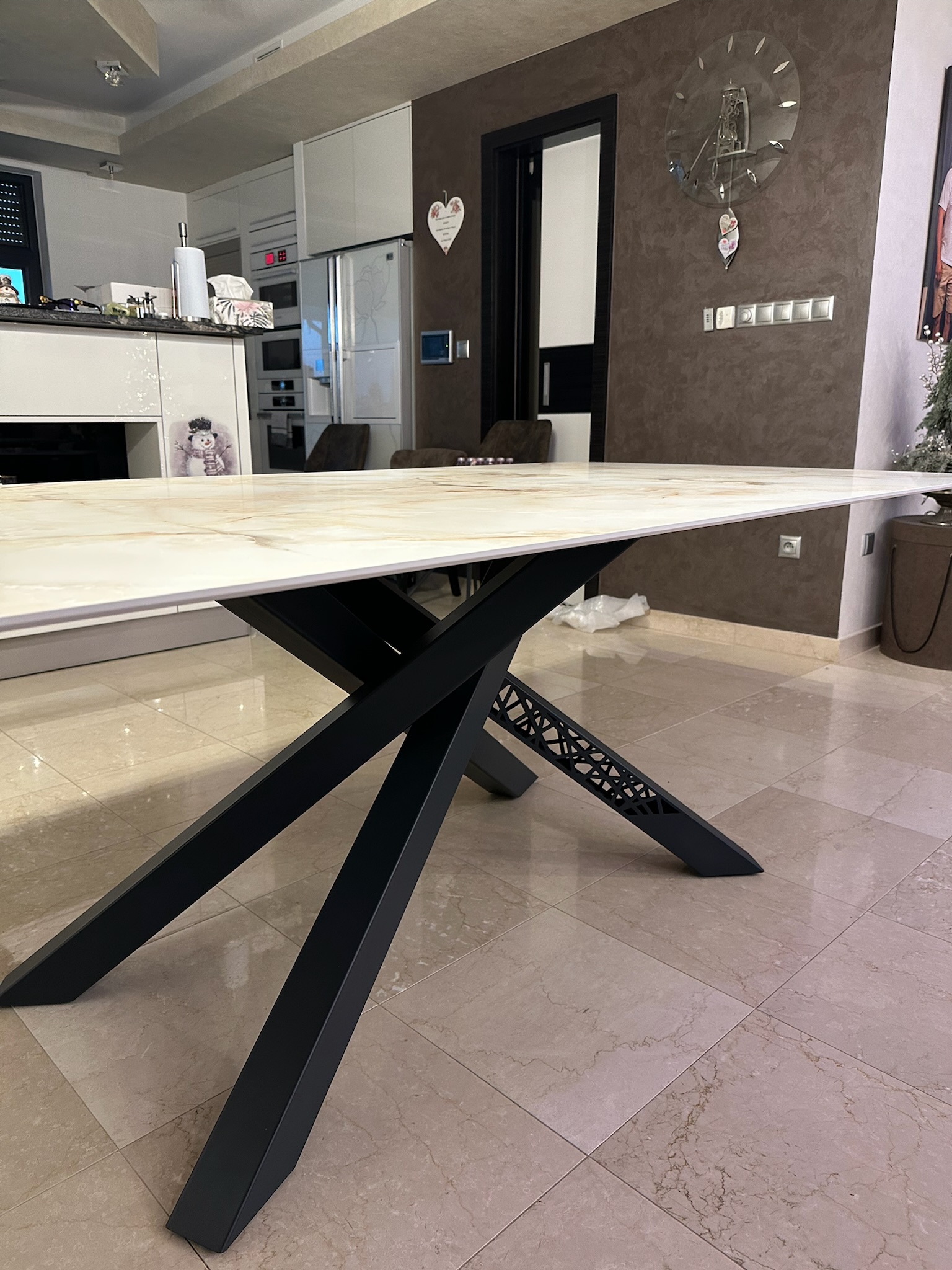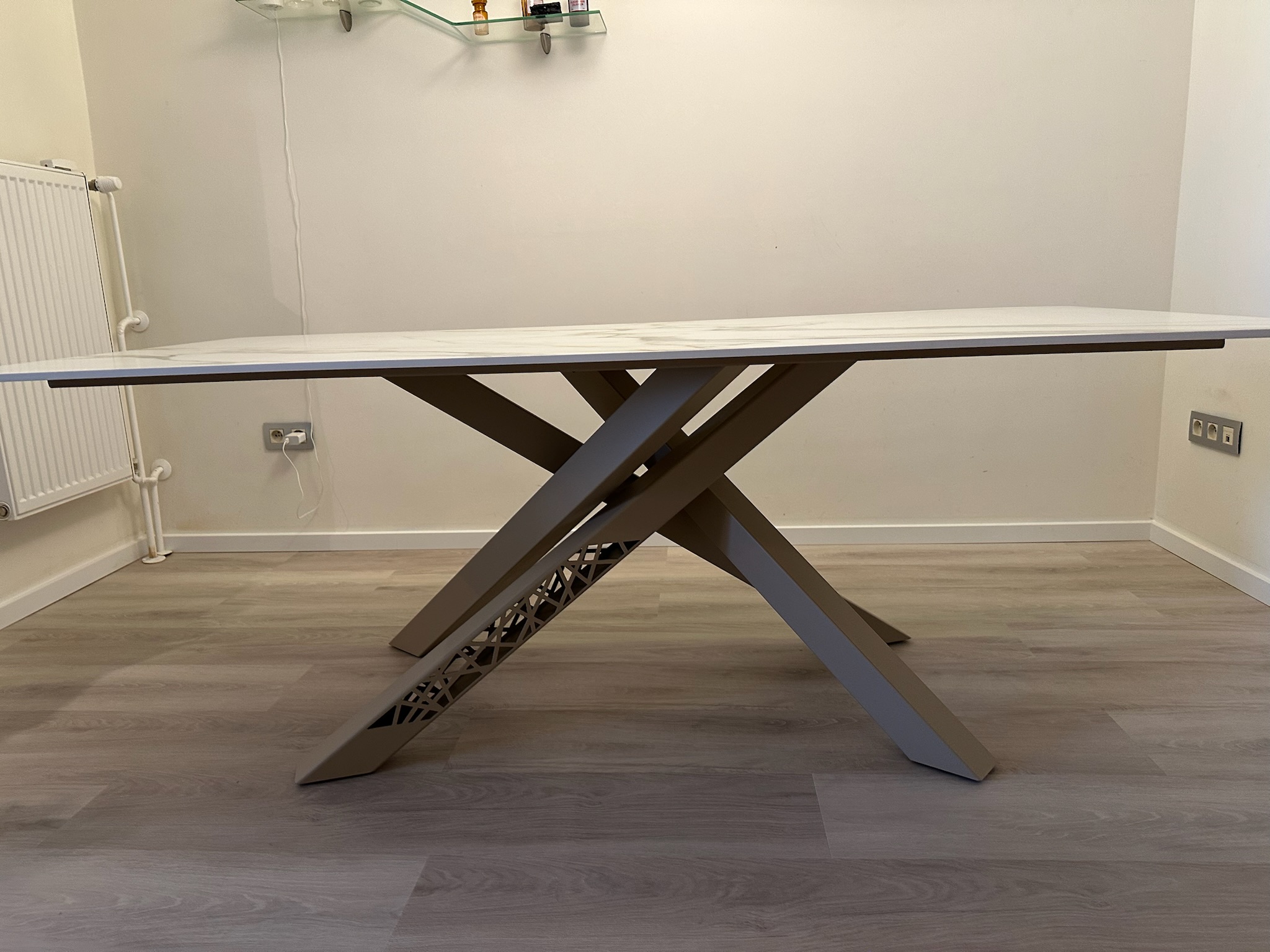 Naše podnože sú navrhnuté tak, aby sa dali prispôsobiť akémukoľvek materiálu stolovej dosky, vrátane skla, drevotriesky, MDF, kameňa, keramiky a masívu. Štandardne sú podnože pripravené na uchytenie dreva alebo drevotriesky. Pre sklenené dosky používame špeciálne nerezové konzolky. Pri kameňoch a keramike riešime uchytenie pomocou oporného rámu na mieru, ktorý obopína celý obvod dosky, aby sme zabezpečili pevné a stabilné uchytenie.