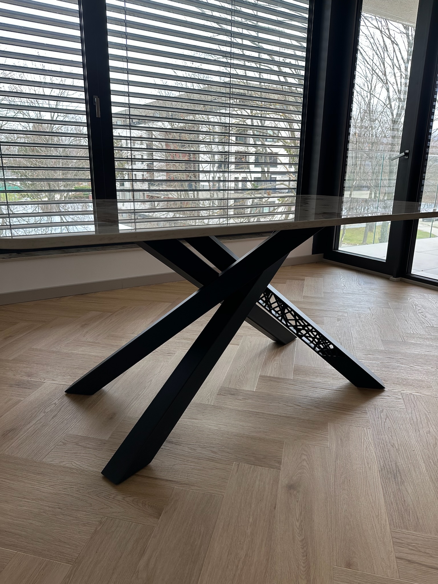 Naše podnože sú navrhnuté tak, aby sa dali prispôsobiť akémukoľvek materiálu stolovej dosky, vrátane skla, drevotriesky, MDF, kameňa, keramiky a masívu. Štandardne sú podnože pripravené na uchytenie dreva alebo drevotriesky. Pre sklenené dosky používame špeciálne nerezové konzolky. Pri kameňoch a keramike riešime uchytenie pomocou oporného rámu na mieru, ktorý obopína celý obvod dosky, aby sme zabezpečili pevné a stabilné uchytenie.