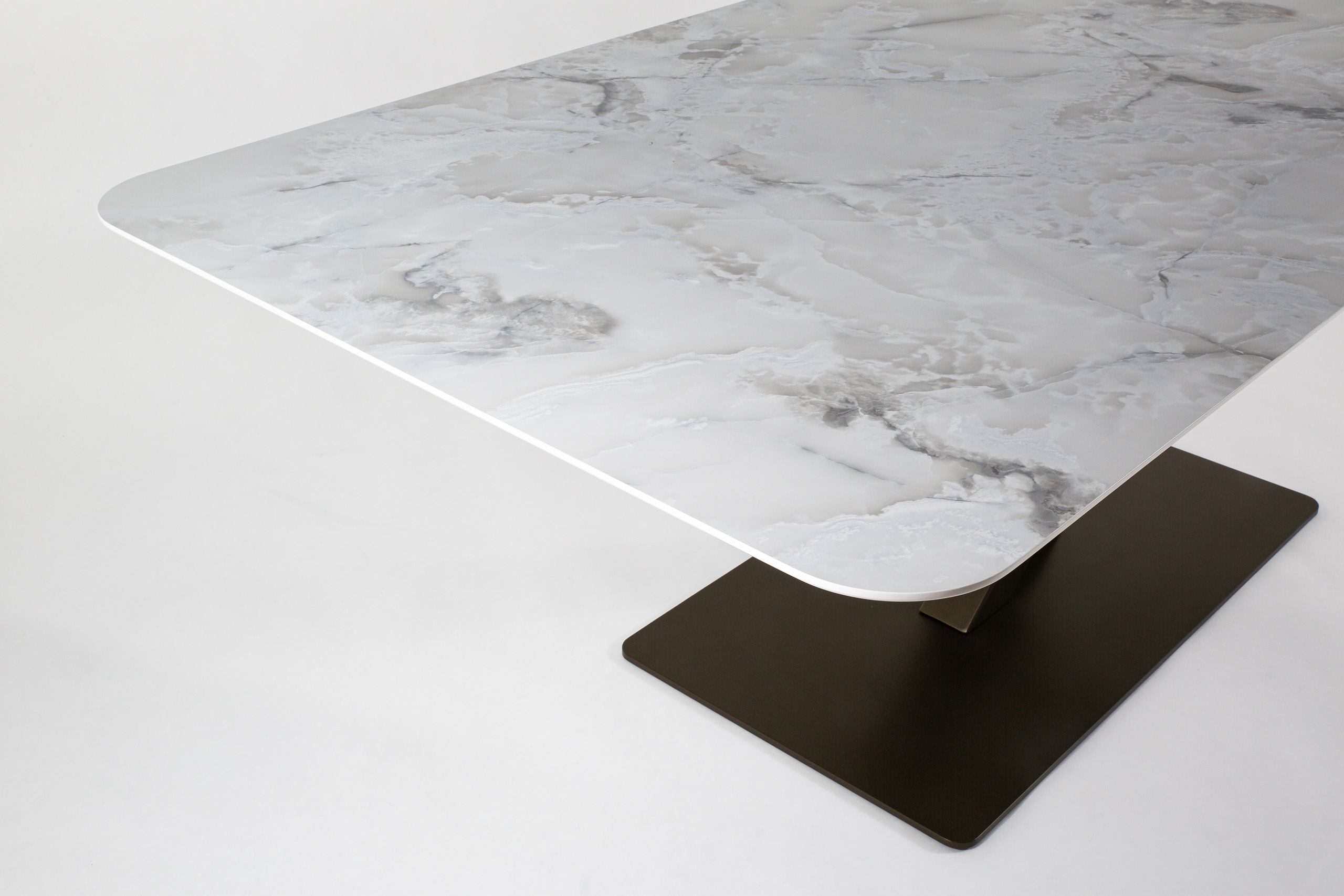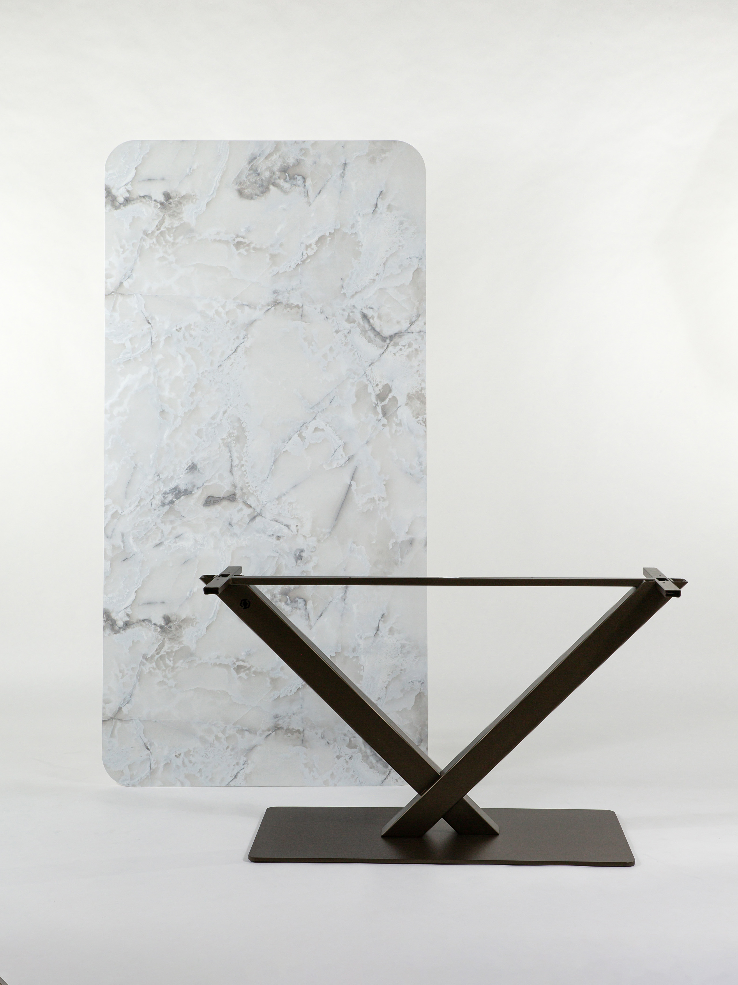 Naše podnože sú navrhnuté tak, aby sa dali prispôsobiť akémukoľvek materiálu stolovej dosky, vrátane skla, drevotriesky, MDF, kameňa, keramiky a masívu. Štandardne sú podnože pripravené na uchytenie dreva alebo drevotriesky. Pre sklenené dosky používame špeciálne nerezové konzolky. Pri kameňoch a keramike riešime uchytenie pomocou oporného rámu na mieru, ktorý obopína celý obvod dosky, aby sme zabezpečili pevné a stabilné uchytenie.